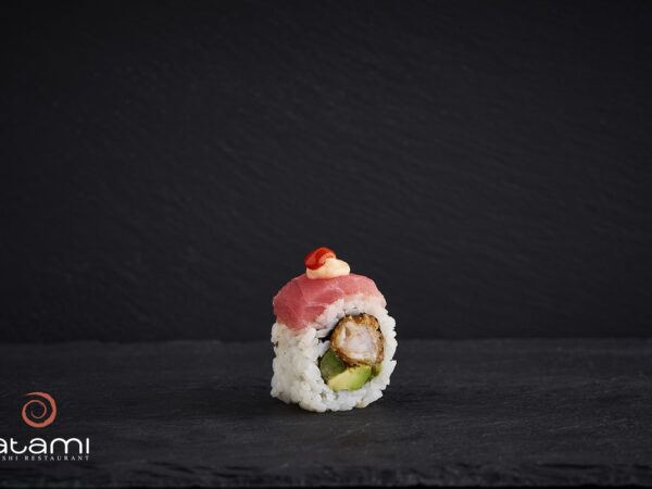 Tempura reje, avocado, agurk, Toppet med tun og spicy mayo, chili sauce (8 stk.)