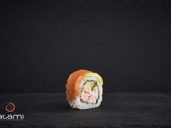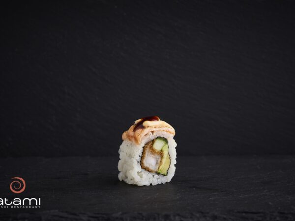 Tempura reje, avocado, agurk. Toppet med laks tataki, spicy mayo og teriyaki.(8 stk.)