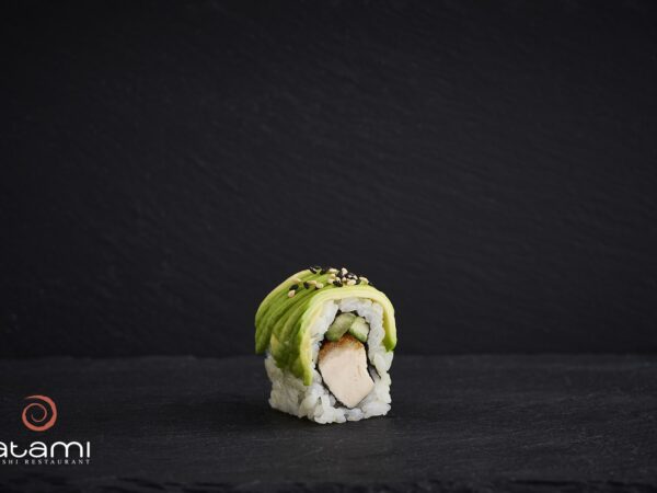Tempura reje, agurk, flødeost. Toppet med avocado, sesam og teriyaki sauce (8 stk.)