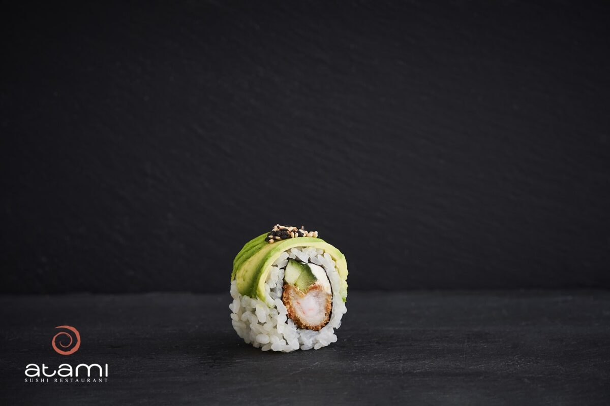 Tempura reje, agurk, flødeost. Toppet med avocado, sesam og teriyaki sauce (8 stk.)